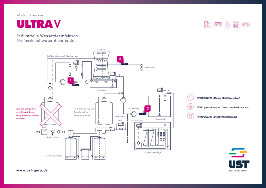Si nécessaire, le rayonnement UV peut être renforcé par de l'ozone. L'oxygène de l'air ambiant constitue la matière première de l’ozone générée dans l'installation. Pour la fabrication, on utilise un émetteur UV spécial, qui est en outre optimisé à 185 nm.